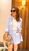 Conjunto shorts + camisa. Shorts curto, botão frontal e elástico na parte de trás. Possui forro e bolsos nas laterais. Camisa oversize. Tecido de ambas as peças maquinetado.
