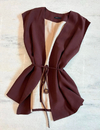 Kimono em forma de colete alongado. Acompanha cordas de amarração e possui forro embutido.